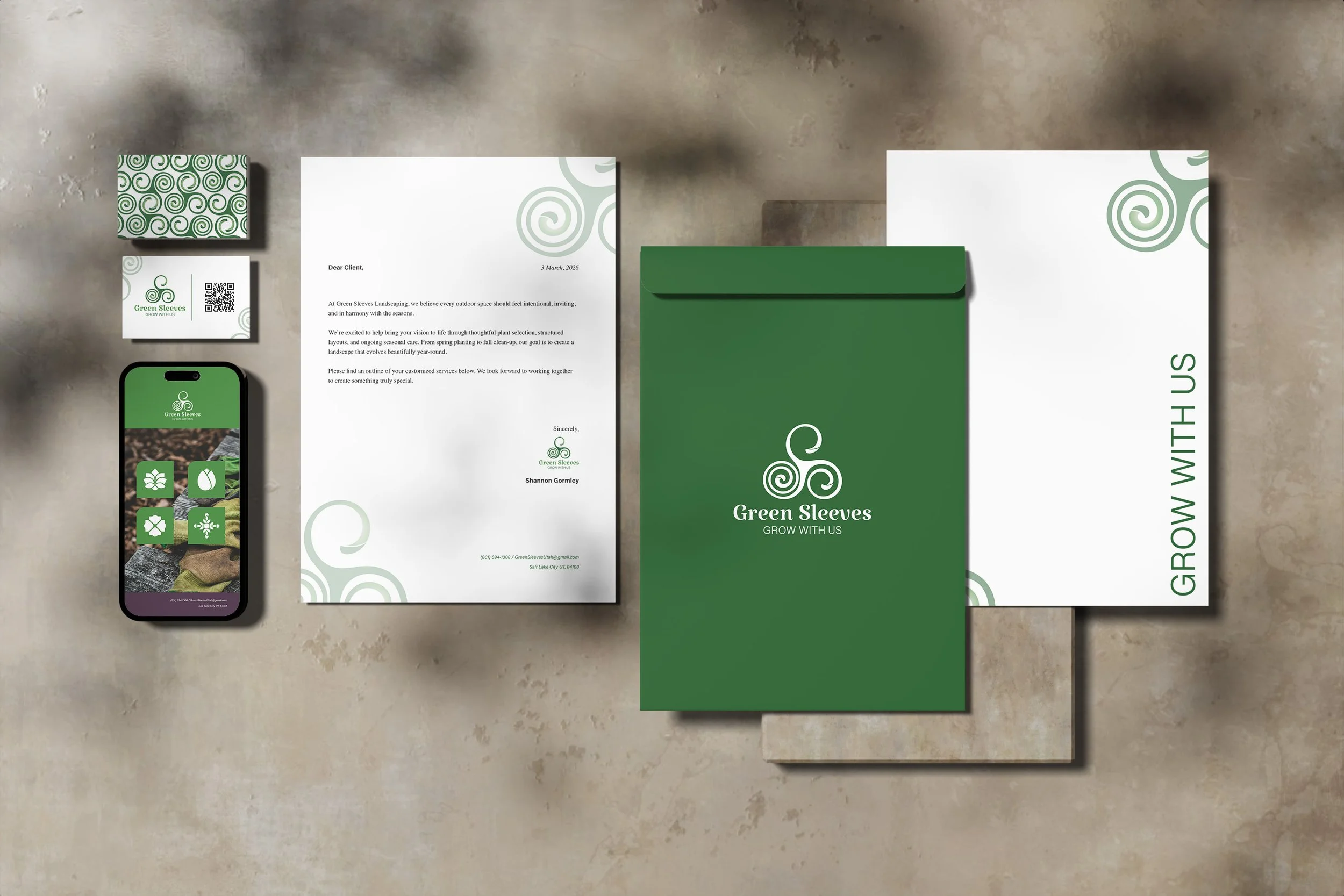 Green Sleeves Landscaping is a Salt Lake City–based landscaping brand designed to bring a sense of elegance and seasonality to a traditionally functional industry, using organic forms, structured composition, and a flexible visual system.